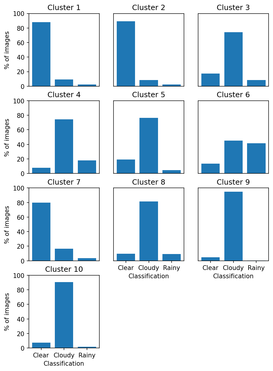 Figure 1. The distribution of hand labels for each ARM Doppler lidar image for the automatically determined clusters. From journal.