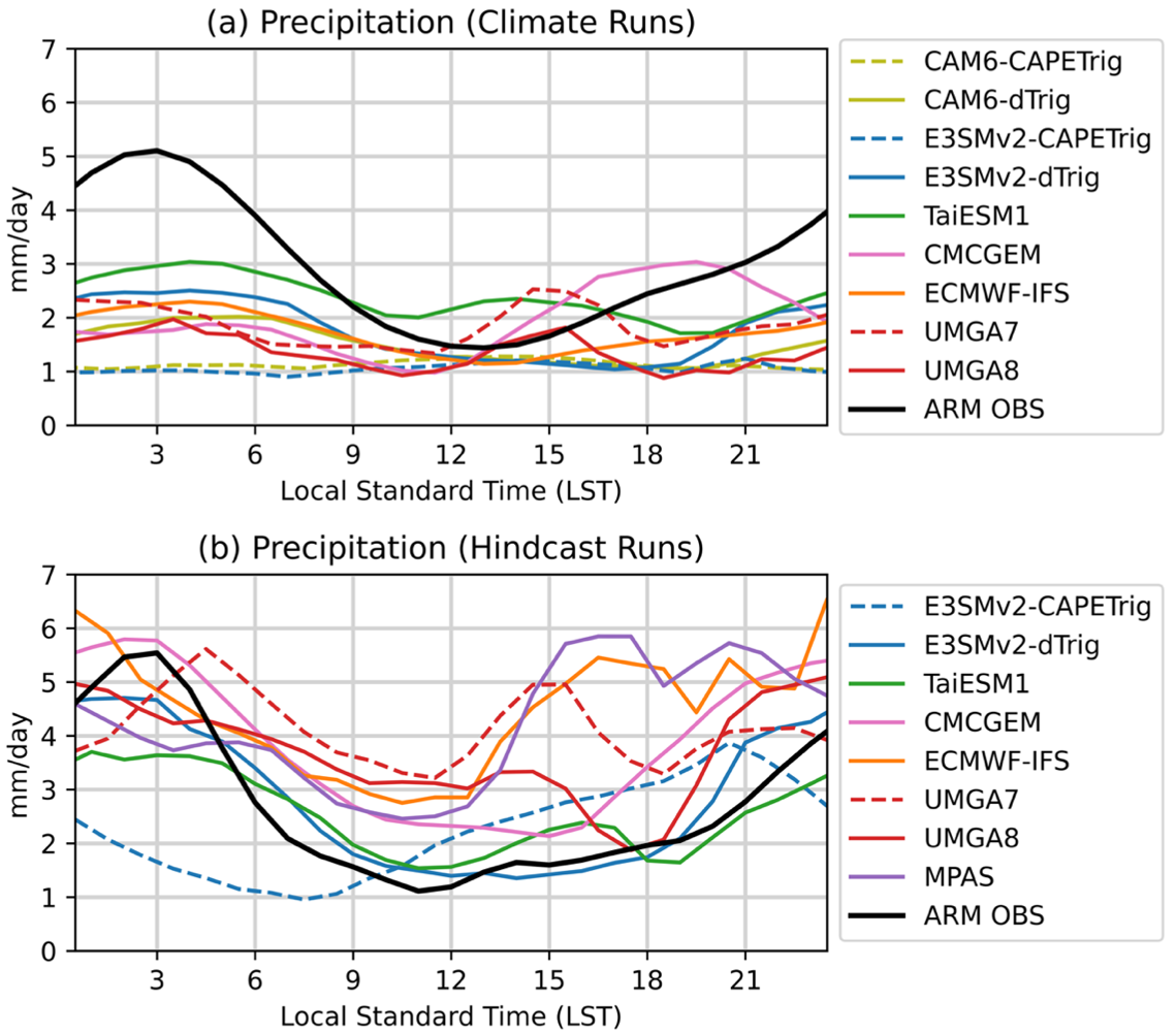 Figure 1. The composite mean diurnal cycle of precipitation (mm/day) for (a) climate runs (June-August, 2011-2018) and (b) hindcast runs (June 01-July 15, 2015). Results from the 5-day hindcasts are averaged over Day 2 to Day 5 hindcast lead time. Domain-mean precipitation from merged radar-gauge products that is available from the ARM continuous forcing data set and the VARANAL value-added product for the Plains Elevated Convection at Night (PECAN) field campaign are used in (a) and (b), respectively. From journal.