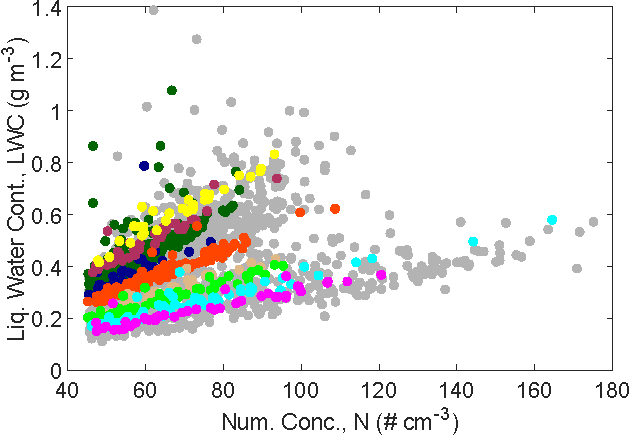 Figure 1. Cloud liquid water content versus cloud droplet concentration, suggesting that microphysical relationships for individual clusters of similar holograms can reflect cloud histories. Cloud liquid water content and number concentrations for different clusters, denoted by the colors, have a linear relationship, with slope depending on the cluster type. As the distribution shape and, correspondingly, the mean diameter remain constant for holograms of a cluster, the linear reduction in LWC with number concentration suggests a predominance of dilution and, complete evaporation of droplets during the mixing process with dry environmental air (inhomogeneous mixing). Image from journal.