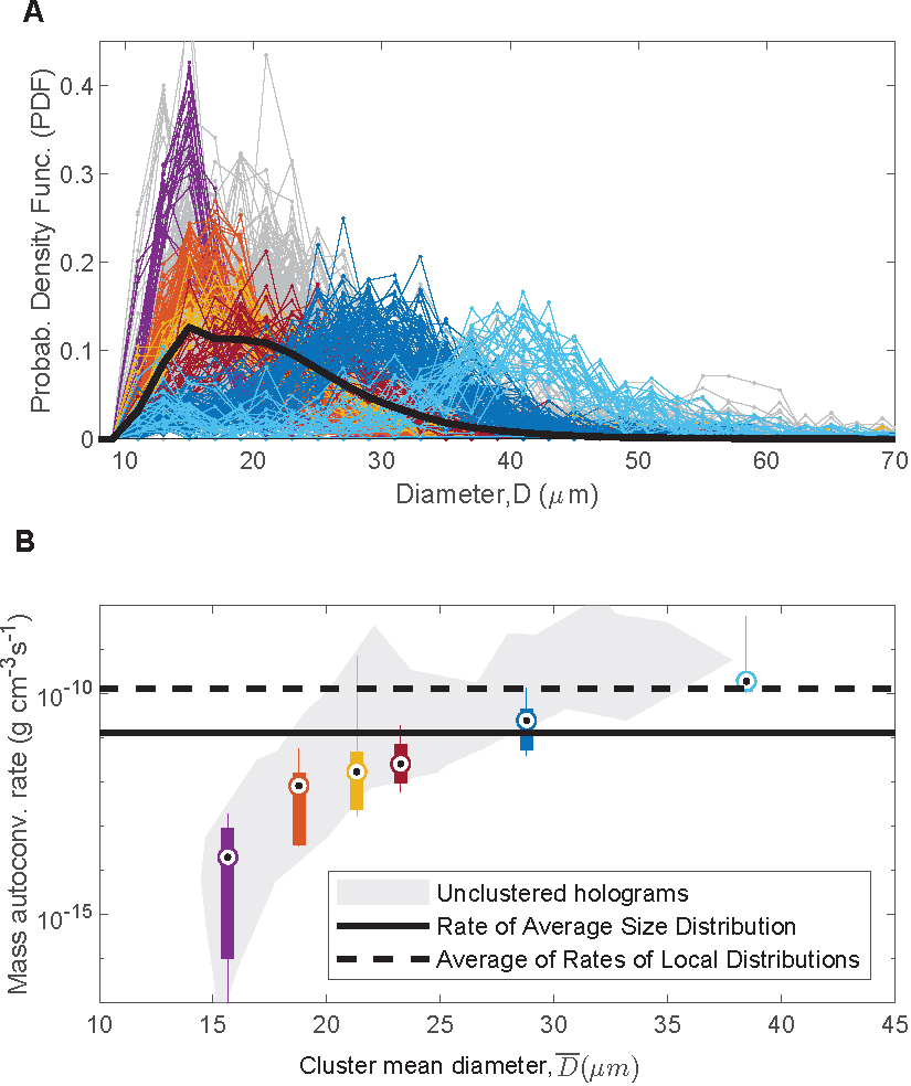 Figure 2. Collisional growth rates for characteristic droplet size distributions. The mass autoconversion rate is a measure of initial cloud droplet growth by collision-coalescence until efficient development of precipitation by accretion. (A) The different colors correspond to the characteristic distributions, and the gray marks the unclustered holograms. The solid black line represents the global distribution for the entire segment. (B) Mass autoconversion rates for the different characteristic distributions versus the mean diameter of the local distributions. The box plots display the median (central dot), the 25th and 75th percentiles (box), and the 5th and 95th percentiles (lines) of the local autoconversion rates for the holograms in each cluster, with the color scheme the same as in (A). Most of the individual process rates differ substantially from the value calculated with the average size distribution, which is represented by the solid black line. That global average rate also differs by an order of magnitude from the average of the local autoconversion rates, which is shown by the dashed black line. The gray region marks the range of autoconversion rates for the unclustered holograms. The data are from a 40-km flight segment in a stratocumulus cloud on 19 July 2017 at an altitude of 1350 m. Image from journal.