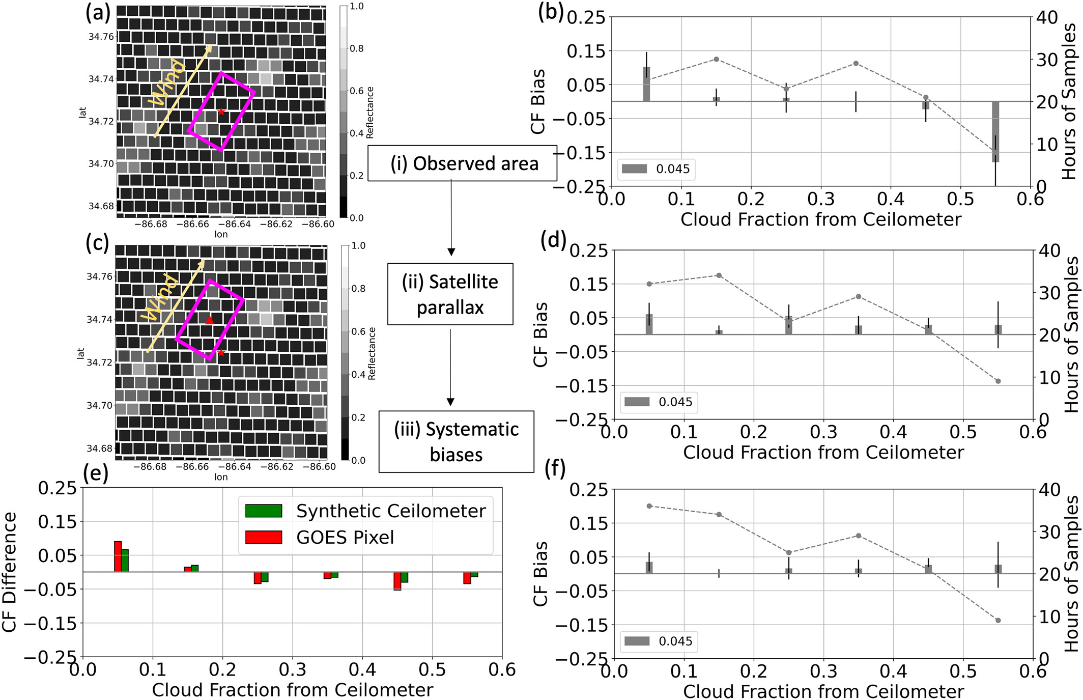 Figure 1. Flowchart summary of the steps used to calculate the spatial cloud fraction (CF) on a satellite image. The Magenta box is the area to calculate the GOES CF at one location. The red star in (a) and (c) is the UAH site location, and the red triangle in (c) is the new center location after considering the satellite parallax issue. The bar plot in (b) is the mean bias (left Y-axis) of hourly CF, CF from the satellite algorithm minus CF from the ceilometer, at different CF ranges from the ceilometer. The CF from the satellite is estimated using a constant reflectance detection threshold of ShCu. Vertical lines on top of bars denote two standard errors across all samples in that CF range bin. The dashed line in (b) denotes each CF range bin’s sample number (right Y-axis). (d) and (f) is the same as (b), but for results after addressing key issues listed in the black boxes in the middle. (e) CF systematic difference between ceilometer and stereo cameras (within a GOES pixel in green and at SGP ceilometer location in red) across various ceilometer CF ranges. Image from journal.