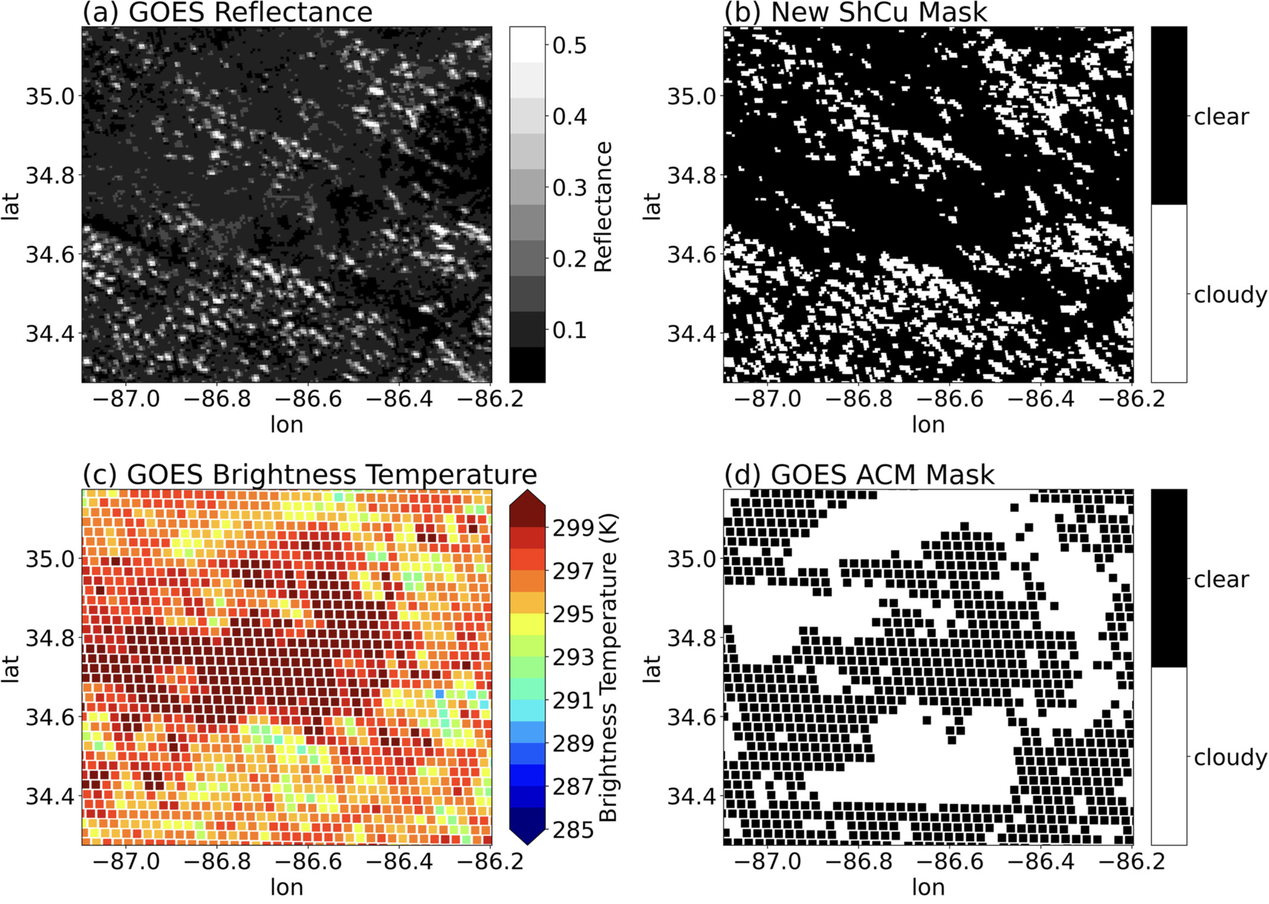 Figure 2. (a) GOES-16 reflectance in the red band (0.64 µm) with a spatial resolution of 600 m at 17:01 UTC on July 5th, 2021, in north Alabama. (b) Cloud mask derived from the new method developed by Tian et al. (2021) from (a) using a detection threshold of 0.045. (c) Brightness temperature from channel 14 (11.2 µm) at 17:01 UTC on July 5th, 2021. (d) GOES-16 cloud mask from the ABI Clear Sky Mask (ACM) data product with a spatial resolution of 2 km at 17:01 UTC on July 5th, 2021. Image from journal.