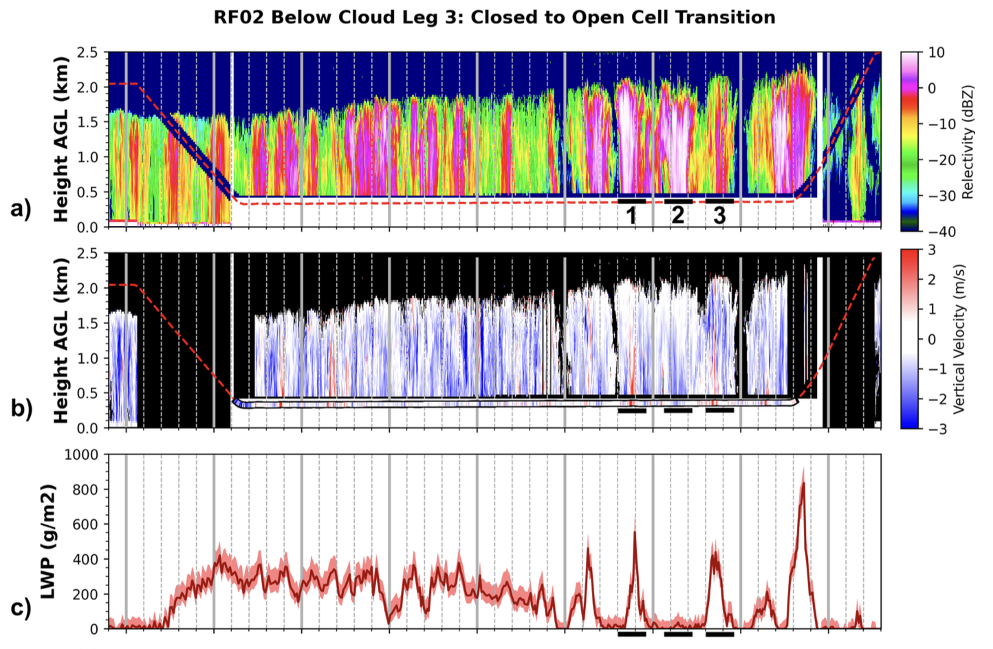 Retrievals from a below-cloud aircraft level leg from 29 Feb 2024 during the NSF CAESAR campaign, across a closed to open-celled transition, with cloud temperatures of ~ -20C. (a) WCR reflectivity and (b) Doppler velocity with in situ vertical velocity included. Plane’s altitude with time indicated with a dotted red line. (c) LWP retrieval. In combination these show how the super-cooled liquid component becomes larger but more inhomogeneous as the clouds transition from stratiform to cumulus, even in these cold conditions.
