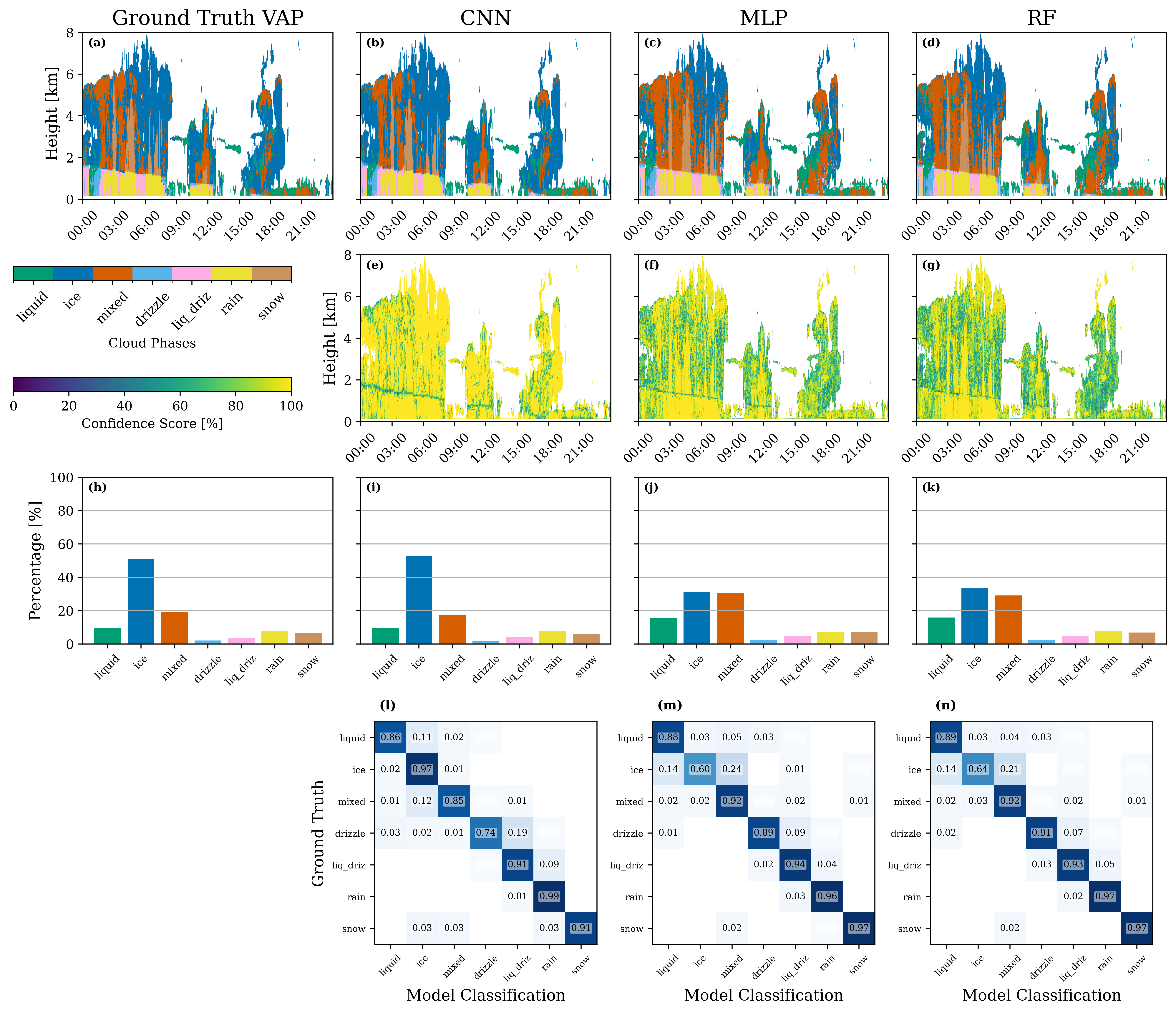 Thermodynamic cloud phase classifications from the three ML models and their comparisons against the THERMOCLDPHASE VAP are shown for August 15, 2021, at the NSA atmospheric observatory: a-d) time-height plots of thermodynamic cloud phase classifications from the VAP, as well as from CNN, MLP, and RF model predictions; e-g) confidence scores of thermodynamic cloud phase classification predictions from the three ML models; h-k) histograms of thermodynamic cloud phase distributions; and l-n) normalized confusion matrices for each model. Figure 3a is identical to Figure 1g. Image is courtesy of the journal.