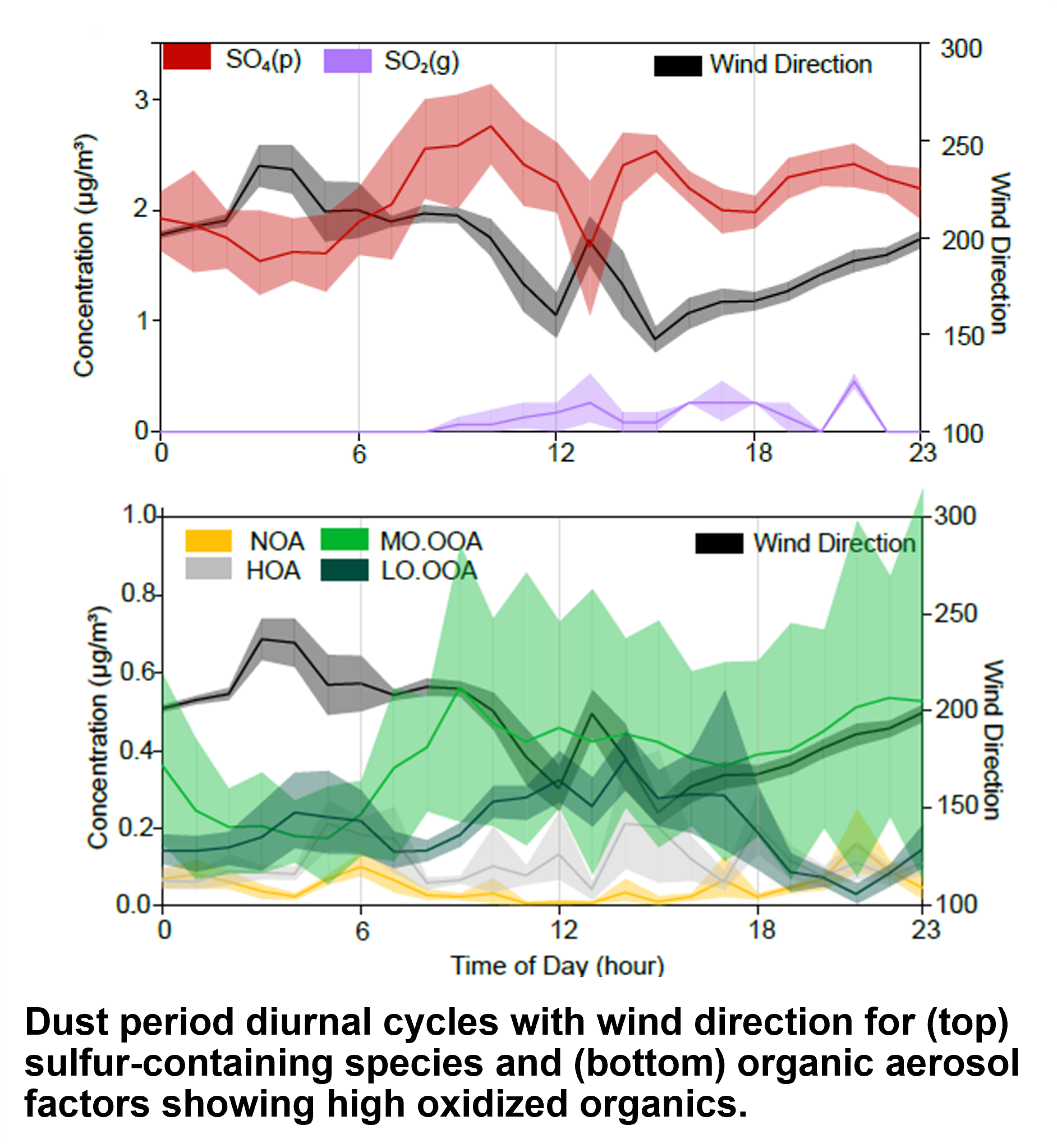 Dust period diurnal cycles with wind direction for (top) sulfur-containing species and (bottom) organic aerosol factors showing high oxidized organics.