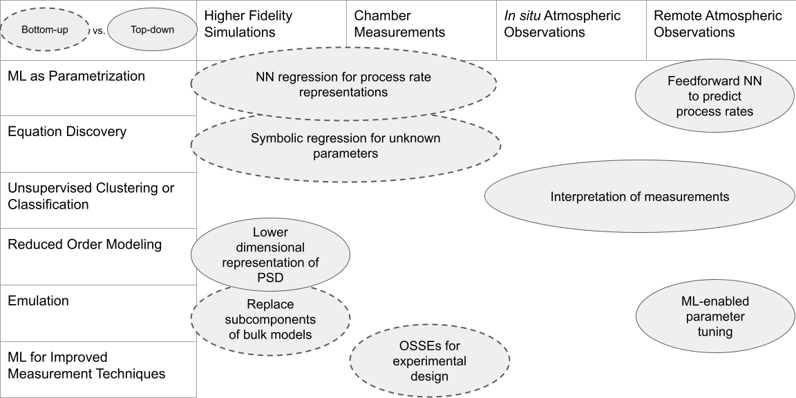 Examples of data-driven approaches applied to bottom-up or top-down cloud microphysical scheme development, categorized by method and data source.