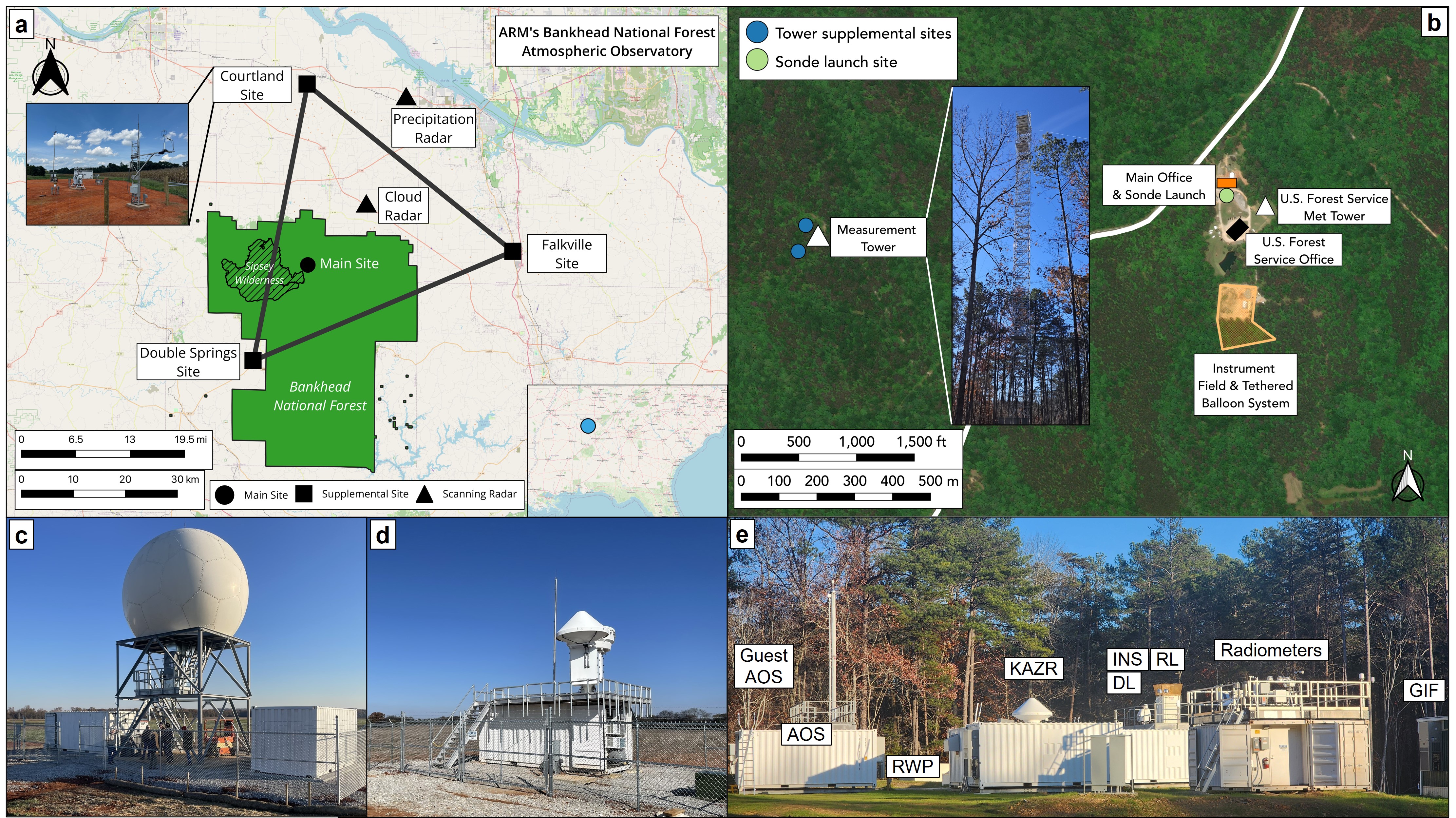 (a) BNF site: location in the N. AL domain, including the Main Site (M1), Cloud and Precipitation Radars, and three supplemental sites at Courtland (inset), Falkville, and Double Springs. (b) M1: location in the U.S. Forest Service (USFS) Black Warrior Work Center, including the 43-m walk-up measurement tower (inset), main office, USFS office, instrument field and Tethered Balloon System hangar. (c) C-band scanning ARM Precipitation Radar. (d) Ka/X-band scanning ARM Cloud Radar. (e) The M1 instrument field, including the Aerosol Observing System (AOS) and Guest AOS, Radar Wind Profiler (RWP), Ka-band ARM Zenith Radar (KAZR2), ice-nucleating spectrometer (INS), Doppler lidar (DL), Raman lidar (RL), radiometers, and the Guest Instrument Facility (GIF). Figure courtesy of Shawn Serbin (NASA GSFC), Patty Campbell (ANL), and Mark Spychala (ANL).